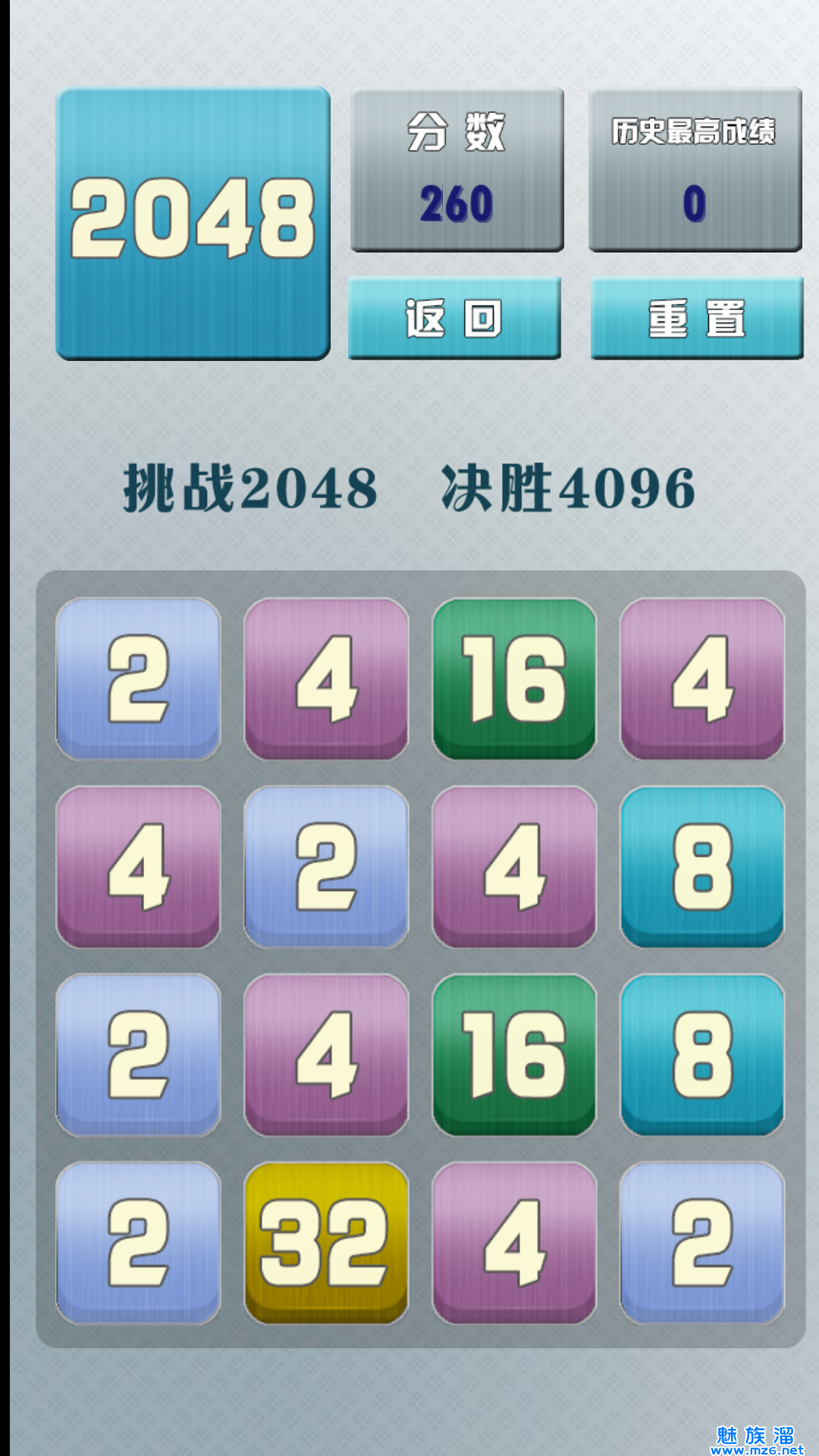 2048模式,相邻相同的数字相碰会合二为一,并且数字翻倍,看你能挑战到2048吗。