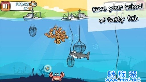 3、注意避免地下的螃蟹和游动的鲨鱼,这个会直接杀死你的小鱼,然后还要躲避渔船的网子;