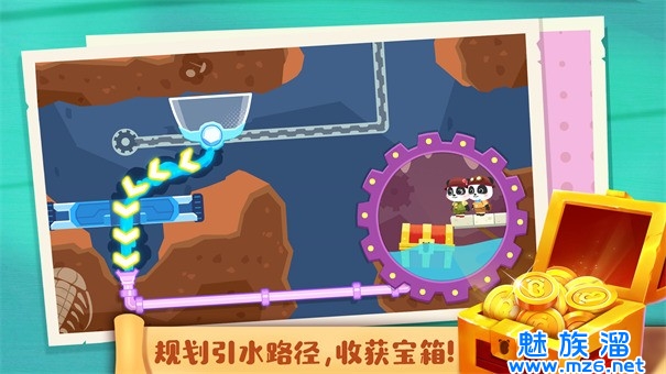 规划水流路径,利用水的浮力,让宝箱浮上来!挖掘土块,控制水的方向。前方有障碍物,注意躲避。这一环节的设计,不但考验了宝宝的应变能力,还将测一测宝宝的空间布局能力。
