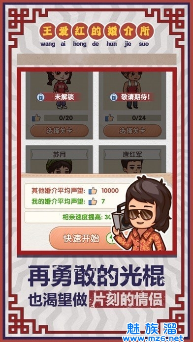 开一间婚介所,最重要的是啥,客源!钻石王老五?高配刘德华?民间嘴炮司机?以及性感的乘务员?数十种人物以及搞笑对白等你来解锁,了解关于他们的爱恨情仇
