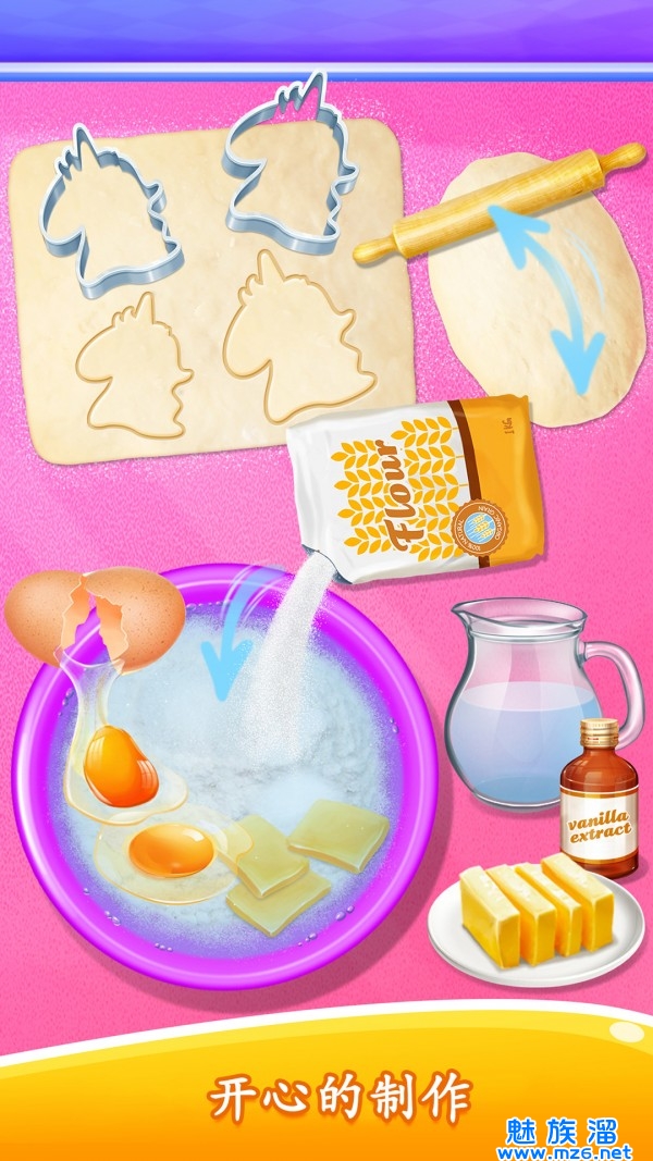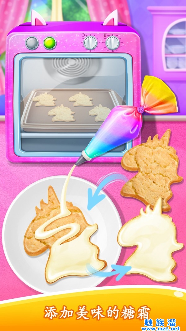 3、独角兽小马饼干教学游戏里,你可以做各种彩虹饼干和特殊的独角兽饼干。