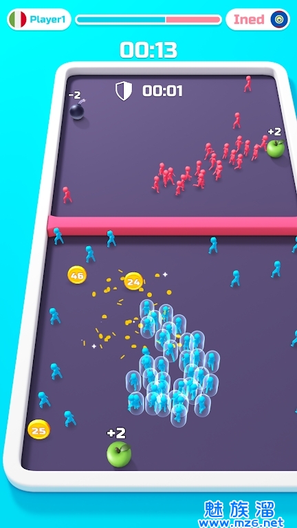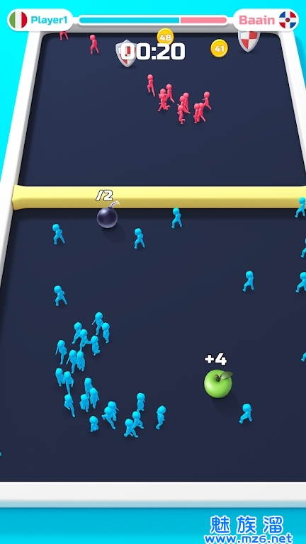 争夺甜甜圈3D描述的是一款趣味十足,休闲刺激的动作竞技类游戏,玩家在游戏中需要控制己方人员进行汇合,然后去收集甜甜圈进行人数的增加,其中还能通过拾取火箭轰炸对方的人员使之数量减少,最后pk双方的人数,人数占多的则获胜,游戏非常紧张刺激好玩,快来下载体验一下吧!
