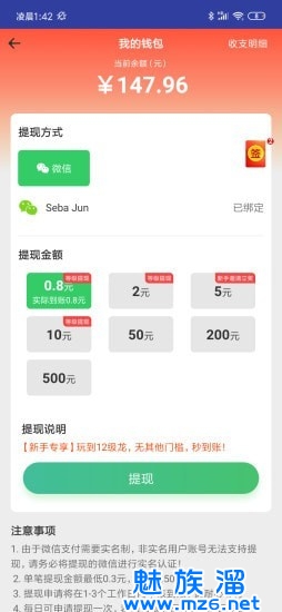 5、首次满0.3元提现到微信钱包,之后满20元起提现,24小时内到账