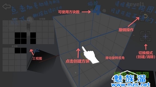 3.游戏的玩法就是玩家需要根据左视图、正视图、俯视图这三个图所显示图像,用你手中的立方体(中央屏幕会显示数量)来放置到大的立方体中去。可能看到这会有玩家说,这还不简单嘛,初中我都学会了,在这里老张需要提醒一下广大玩家,这款游戏锻炼的是我们大脑的空间几何能力、大脑思维能力,在玩游戏的时候前几关你可能会觉得游刃有余!但是越到最后玩家就会逐渐感受到心有余而力不足。