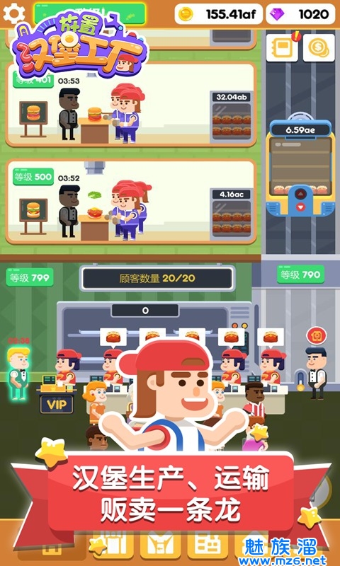 游戏中玩家将扮演一名工厂老板工厂内主要生产美味汉堡,游戏中玩家需要招募非常多的员工加快制作汉堡速度,