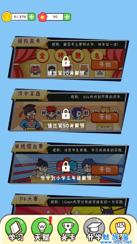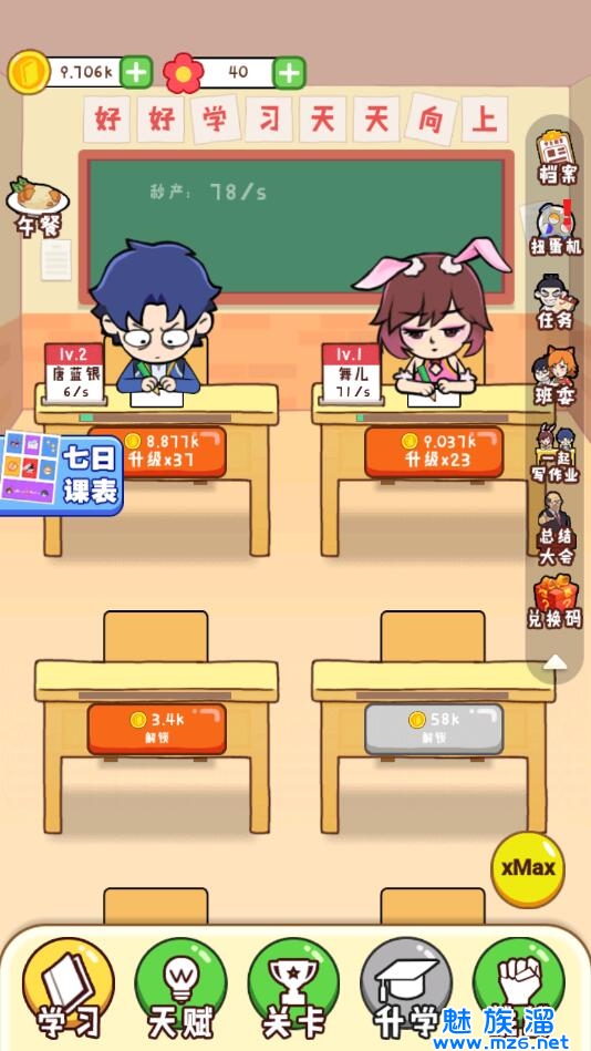 本游戏还设计了全服排行榜,可以跟其他玩家同台竞技,pk学生。有秒产排行榜、升学排行榜、学习排行榜等。