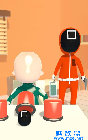 是一款在移动的盖子中猜鱿鱼面具、糕点或物品的鱿鱼游戏衍生作品,