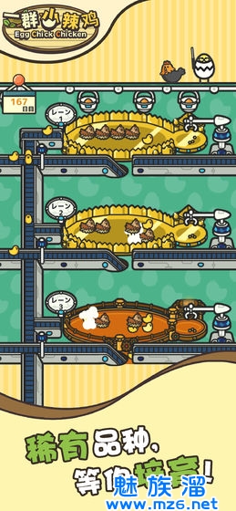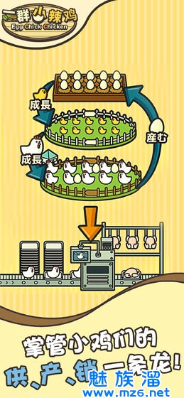 一群小辣鸡是一款放置类型的经营模拟游戏,游戏Q萌的画风让游戏很有爱,培育鸡蛋、孵养小鸡、种鸡生蛋、或加工成为肉制品售出,升级工程设备加快速度,努力打造出最先进的养鸡场。