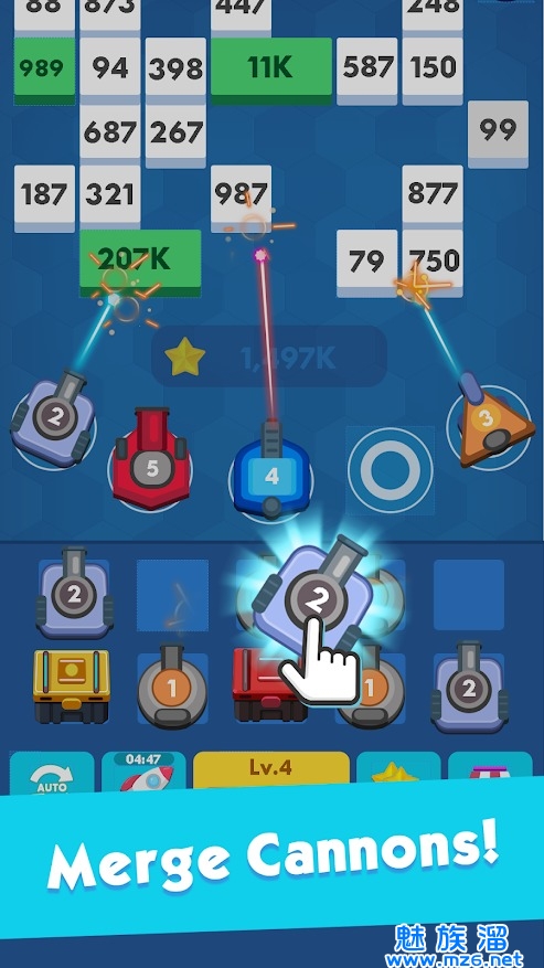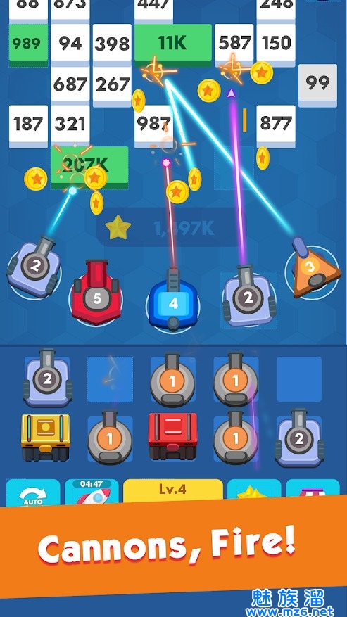 2、将大炮放置到指定的炮台上,就会自动射击不断掉落的带有数字的方块。