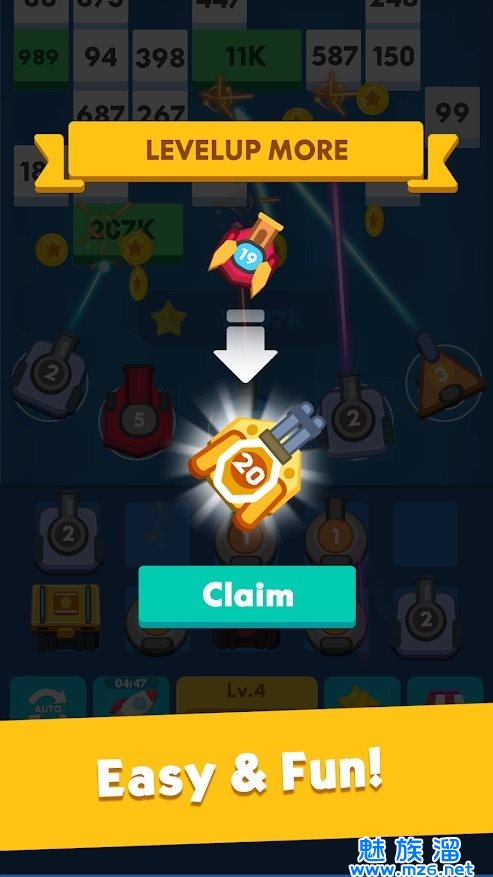 4、不断自动射击上方掉落的方块,不要让方块掉落下来。