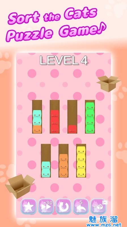 排序部分的玩法和水排序类似,只不过是将水变成了各种颜色的猫咪,