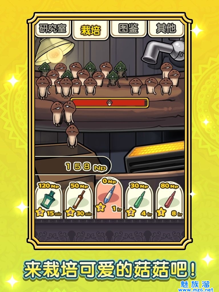 2.等有了NP后,首先要升级道具,照明器增加稀有蘑菇的出现机率,加湿器加长成年蘑菇的保鲜时间,保温器加快蘑菇的生长速度。等有剩余的钱再来考虑买药品,这样划算一些,毕竟药品的使用是有期限的。