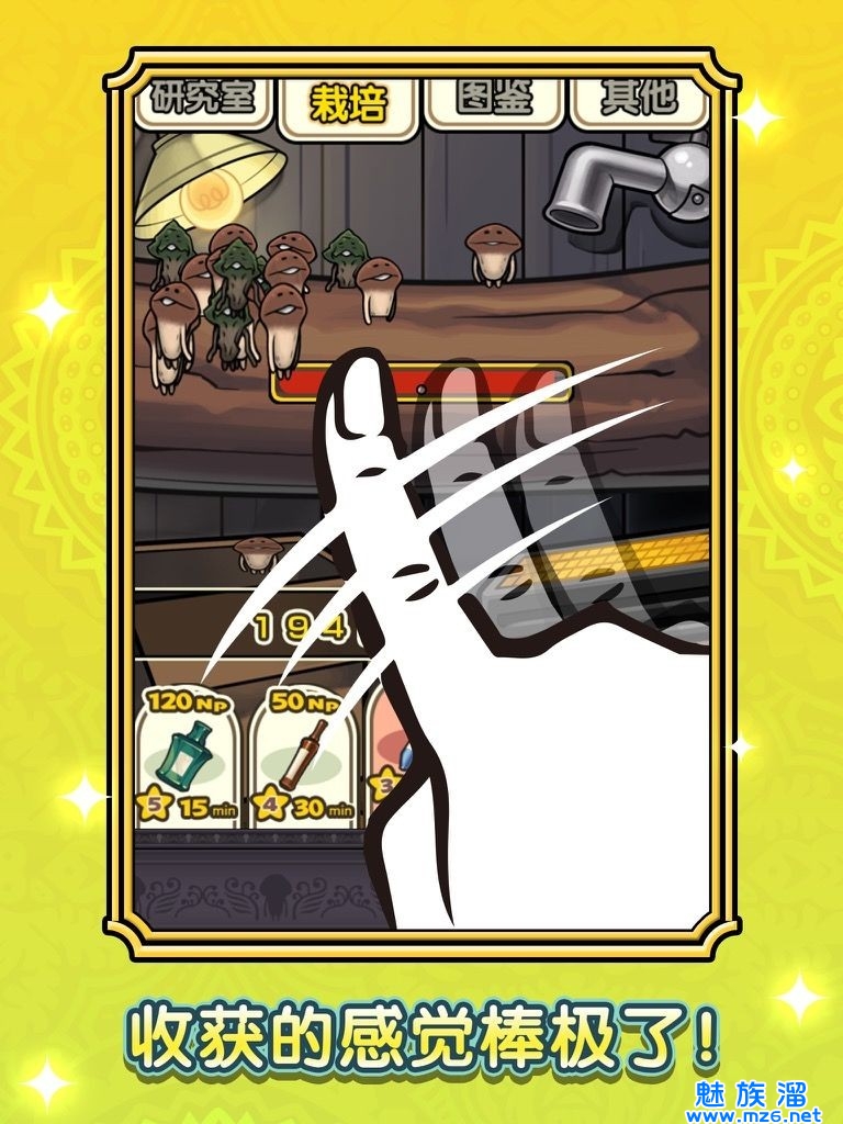 有很多种类的蘑菇单价也不一样,玩家利用NP买营养剂养菇,等菇长大再卖掉赚取NP,但也有免费营养剂可使用。玩家还可以选购不同的灯、木头、加湿器等工具,当木头长太多坏菌时记得要清洗!有各种奇形怪状的香菇类型,设计这个游戏的人很童心未泯啊!将道具升级后,就会慢慢长出稀奇古怪的菇种,很有成就感!