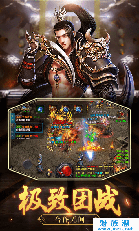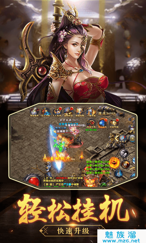 屠龙再现,闯天关爬天梯无限制PK,万人同屏激战。