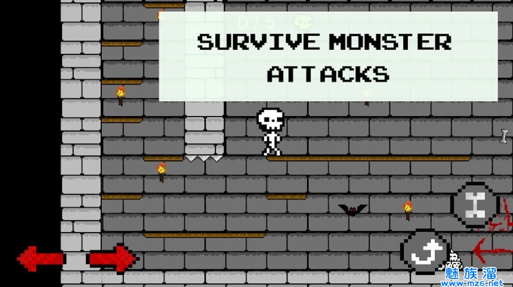 1、左右控制骷髅移动,点击右下角跳跃,x符号可以射出骨头棒来攻击对手;