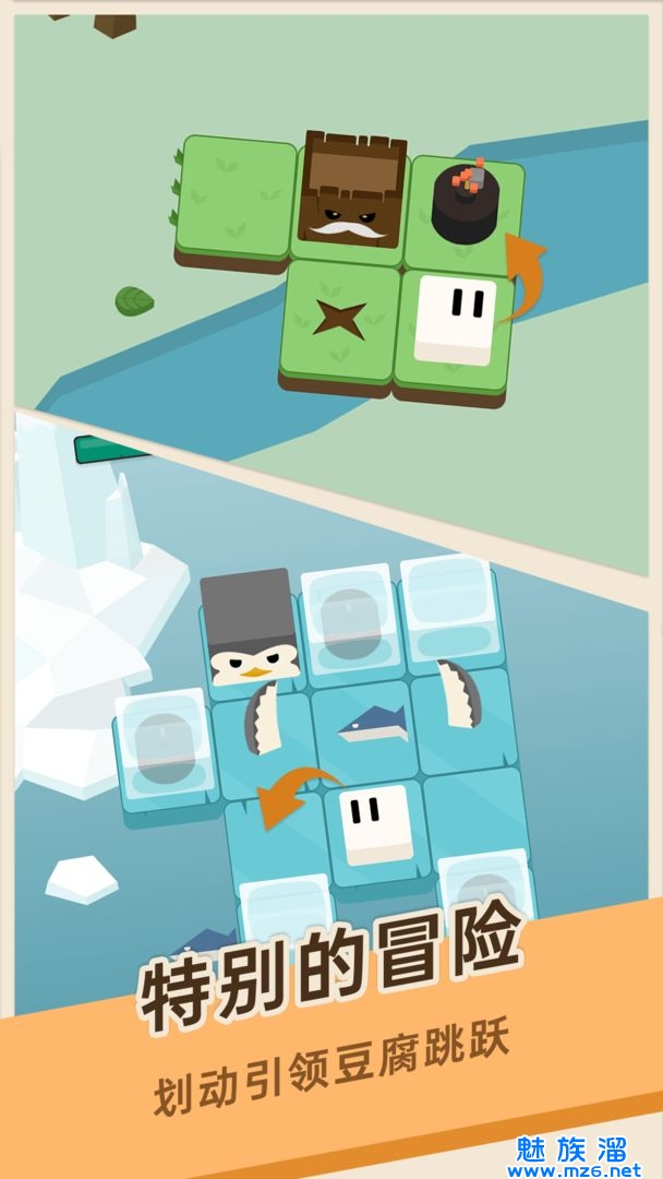 划动屏幕,操作豆腐在格子间跳跃,躲避各种障碍物,达成闯关目标!