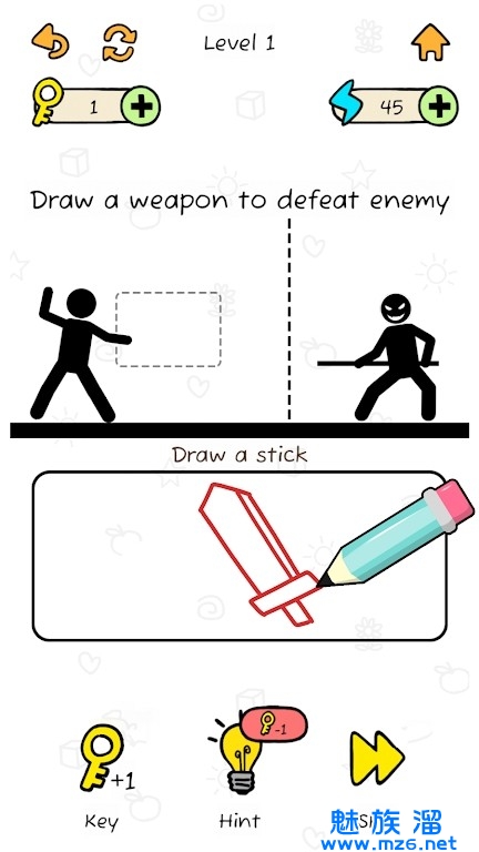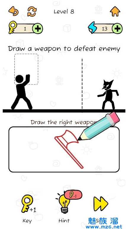 画出武器2是一款超级好玩的休闲益智的绘画动作游戏,在这款游戏里,玩法十分的简单,且玩家只需要不断的利用自己的画笔,来保护自己,且遇到危险的时候,可以画出各种各样的道具,来帮助自己,游戏非常的考验玩家的思维能力,感兴趣的小伙伴们,赶紧来下载去玩吧。