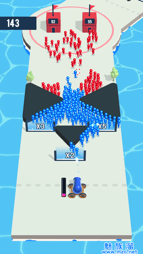 1.玩家控制着炮台,释放炮弹兵,在经过倍数门的时候会增加炮弹兵的个数;