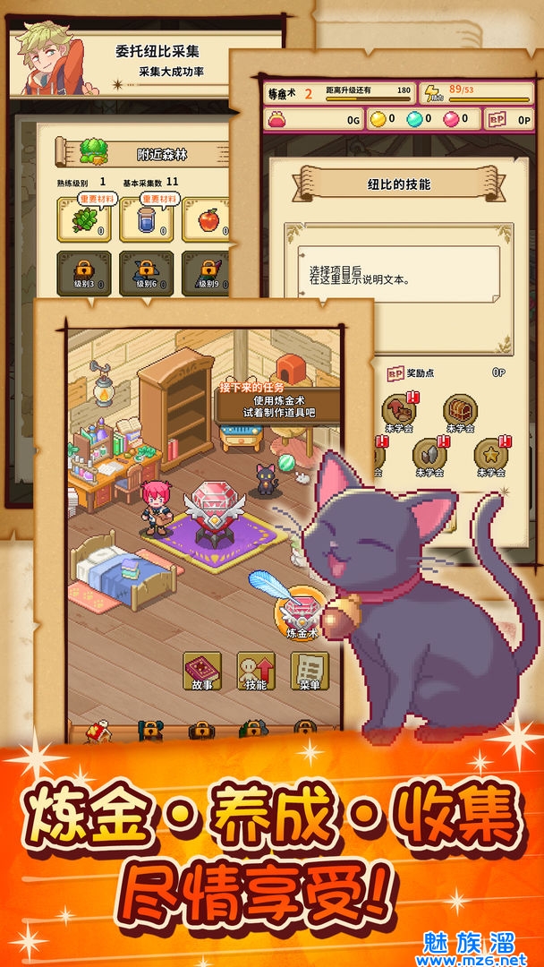 您需要不断的进行发展,学会更多的炼金术,卡通的游戏画风很舒适,有趣的剧情也非常治愈;