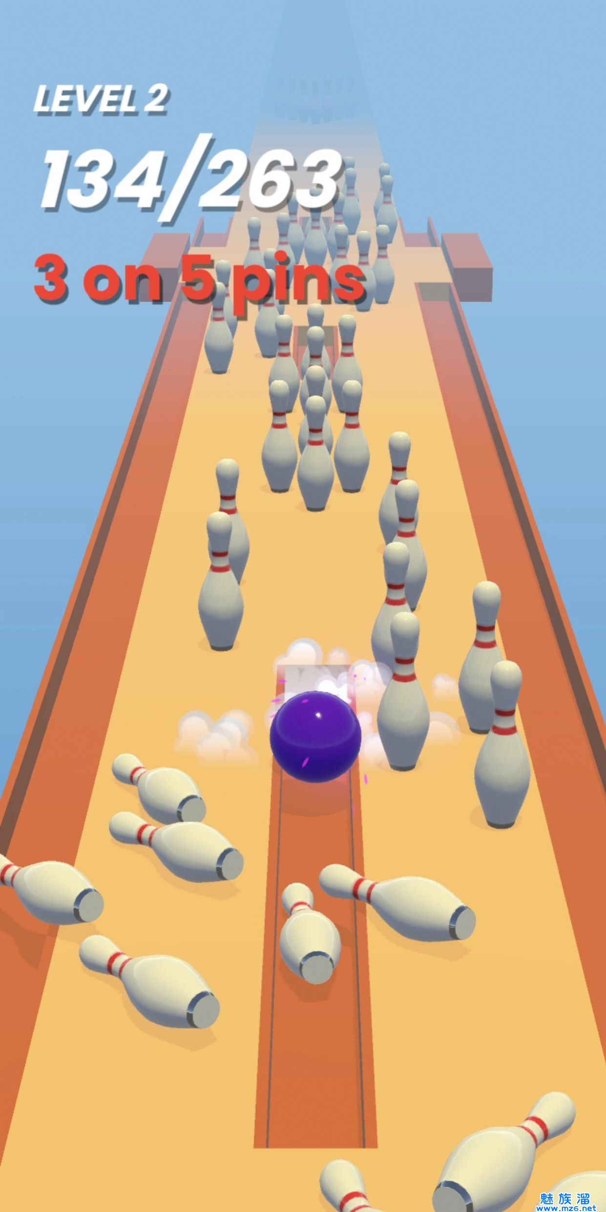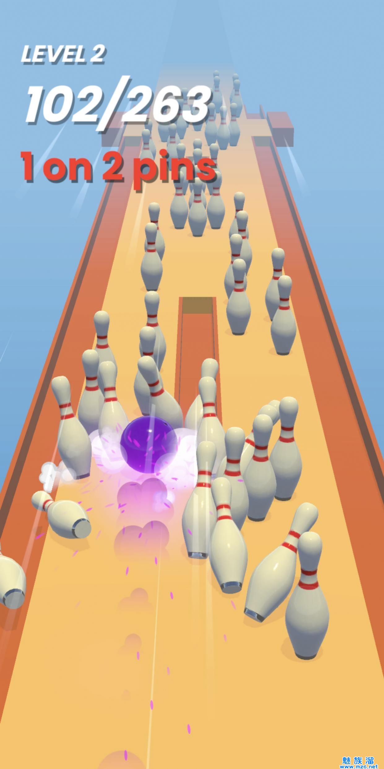 1、灵活的手指操作,控制好你自己的保龄球来完成跑酷冒险。