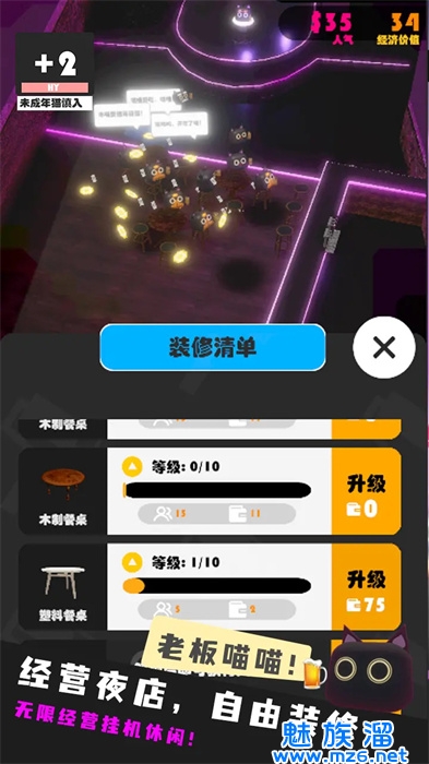 这款游戏运用了模拟经营的玩法方式来展现,让猫咪当老板经营,让玩家体验音乐摇滚的过程;