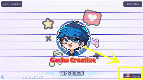 1、在本站下载并安装加查创意(GachaCreative),进入游戏后可以看到游戏默认为英文,需要点击右下角按钮,如下图所示