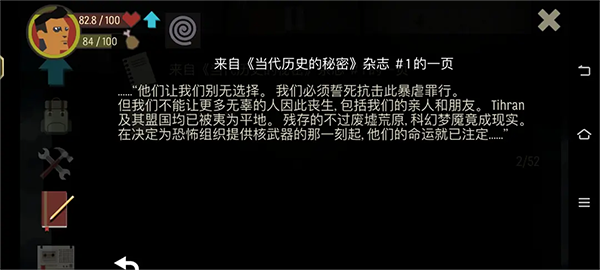 1、资源匮乏,生存挑战。主角补给即将耗尽,为求生存,必须离开困住自己的高层酒店,在荒废城市中艰难穿行,搜寻食物、武器和装备等一切能保障生命、增强自身能力的资源。