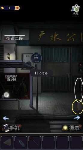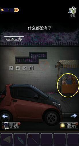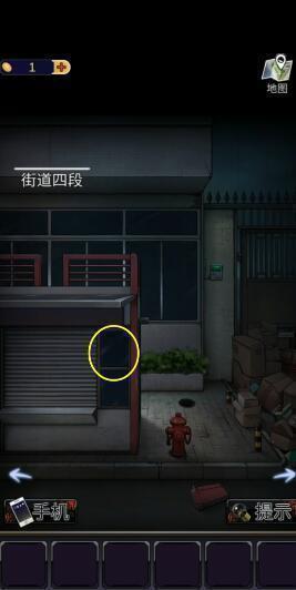 1、点击箭头来到街道四段,点击下图圈出的位置,获得【纸条碎片】、【铲子柄】和【机油】。