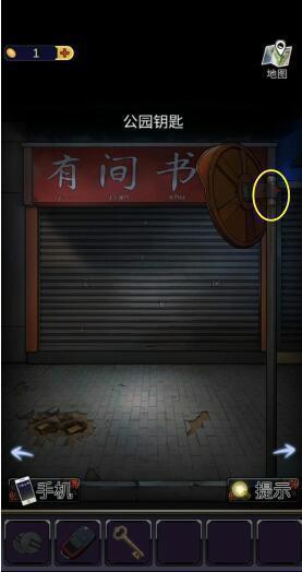 13、返回报刊亭的街道四段,点击下图圈出位置,使用钥匙打开玻璃门,得到【阀门】。