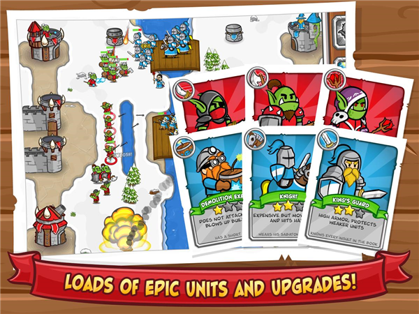 每个关卡开始前都可以自由的选择兵种来搭配,它们可以升级,完成关卡后获得的宝石可以用来升级,升级之后各项属性都会提高不少。