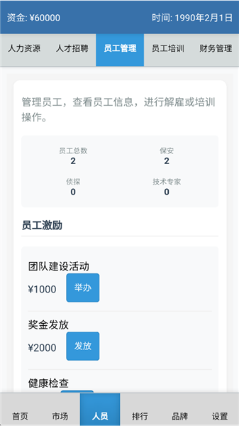 员工类型:保安、侦探、技术专家三种类型