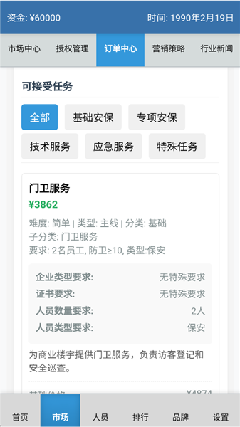 《安保集团》是一款以文字模拟经营为核心的休闲手游,玩家将扮演安保公司老板,从一家小型企业起步,逐步通过招募人才、获取证书、完成订单等方式发展壮大,最终目标是成为跨国安保集团。游戏以订单服务为核心经营思路,玩家需通过完成各类订单获取资金和提升影响力。初期订单多为小区巡逻、店铺安保等基础任务,随着公司发展,可承接网络安全咨询、危机应对等高级订单。
