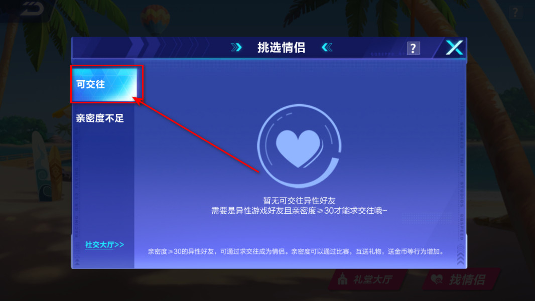 3.在可交往处能看到大于等于30亲密度的好友,就可以申请交往了,小编单身狗一枚就没有了。