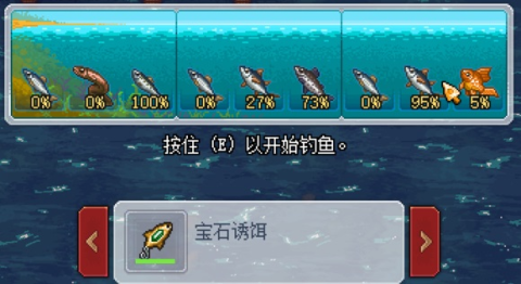 到达钓点之后,点击手指图标开启钓鱼,每条鱼下方的百分比意味着你此次钓到该鱼的几率。长按手指图标抛钩,浮漂便会开始移动,松开手指,浮漂就会停下,钓鱼操作随即正式开始。尽可能让指针停在几率高的鱼上面。
