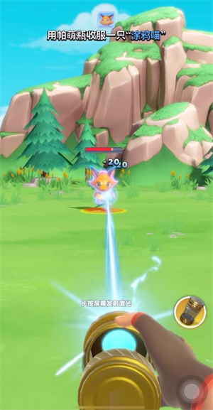 3、当遇到帕尔蒙后可以进行战斗,进入战斗后按住屏幕可以使用帕萌瓶进行攻击,当帕尔蒙血量降低到一定程度后就可以收服。