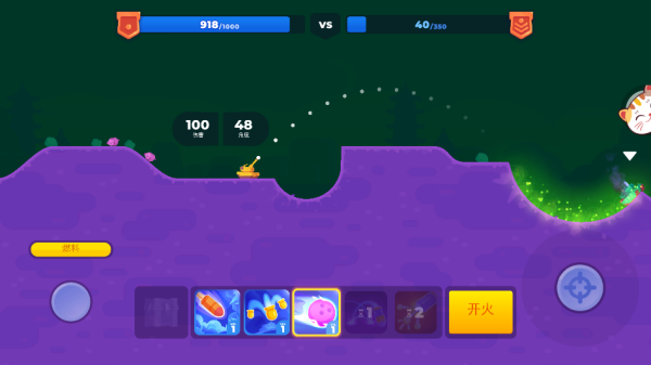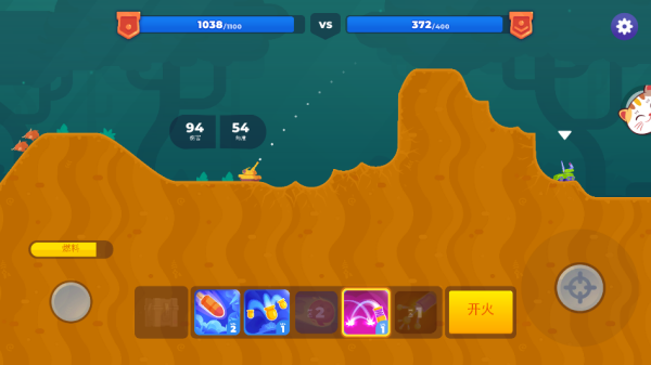 1、左侧滑动控制坦克移动,移动消耗回合燃料,右侧调整射击角度攻击敌人。