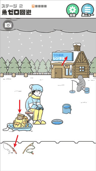 点击远处的广告牌上的鱼竿即可获得,然后点击书包获得鱼饵,接着点击钓竿即可进行钓鱼,成功掉上鱼即可过关。