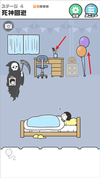 从桌子上拿到马克笔,和旁边的气球,两者组合后会获得一个人脸气球,将气球放到人的身上,死神就会误以为是本人带走,这样就顺利过关了。