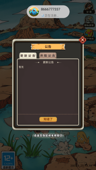 4.初次进入游戏,你会看到相关的游戏公告。