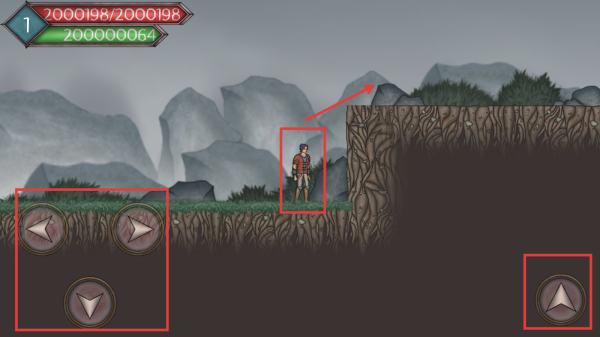 2、在操控界面,点击向左、向右按键让角色左右移动,点击向下按键可以下蹲,点击向上按键跳跃,长按可以跳得更高。