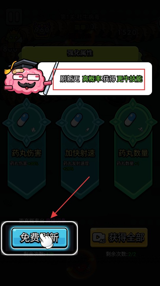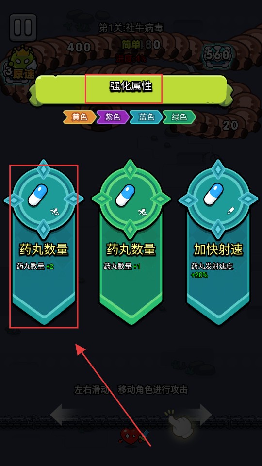 1、强化时选【药丸数量-+2】属性,增加药丸数提升输出频率,前期快速清病毒积优势。