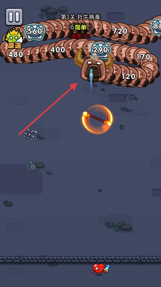 2、战斗时左右滑动移动角色,用武器攻击病毒,优先打高数值敌人,保证输出效率。