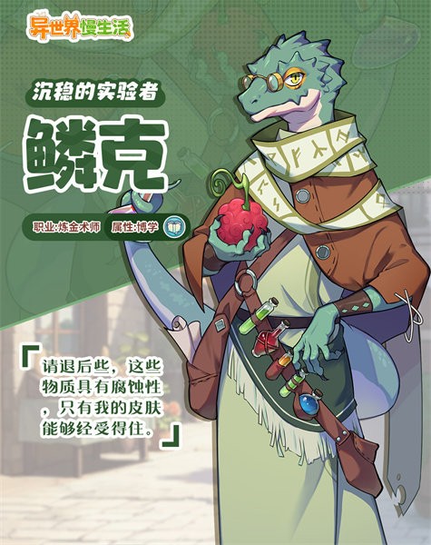 蜥蜴族的炼金术师,平时有些沉默寡言,但对研究与学术有着近乎狂热的执着,在得到想要的结果之前连眼皮都不会眨一下。