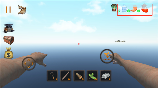 8、正式进入游戏后,玩家可以长按钩子,将它发射到海洋中,红色的小圆圈代表发射位置,发出钩子后,玩家要看准时机,及时的点击同样图标,收回绳子取取回勾到的物资,如木板,杂物,树叶,桶等,它们通过加工可以为你的生存提供方便;