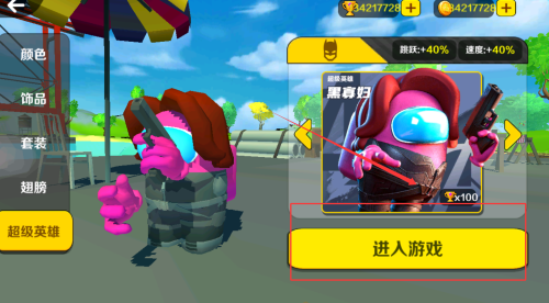 2、想要装扮你的角色,可以点击“颜色”、“饰品”、“套装”和“翅膀”这些选项,比如选择“超级英雄”里的“黑寡妇”。