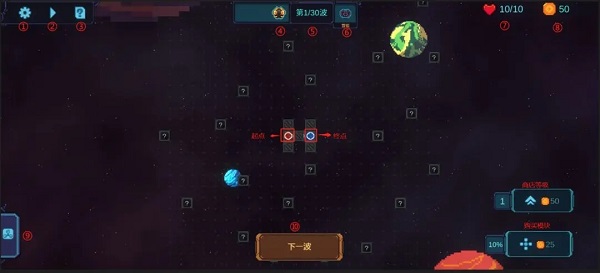下一波:发起战斗的信号。点击后将无法再进行构建、合成重构塔等操作,仅可点击重构塔进行升级,请谨慎考虑后再点击。
