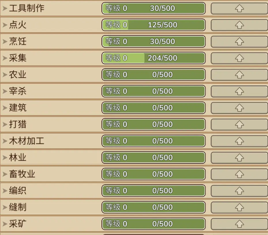 游戏中一共有17类技能种可以升级,分别是:农业、工具制作、建筑、木材加工、林业、点火、烹饪、编织、采集、宰杀、打猎、畜牧业、缝制、采矿、铁匠、陶艺、青铜加工。