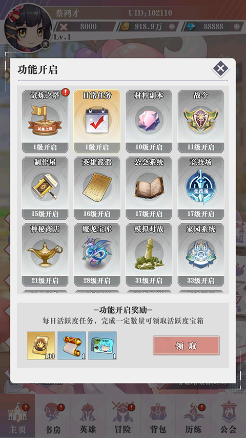 4、功能开启:每开启一个新功能也会赠送开启奖励。