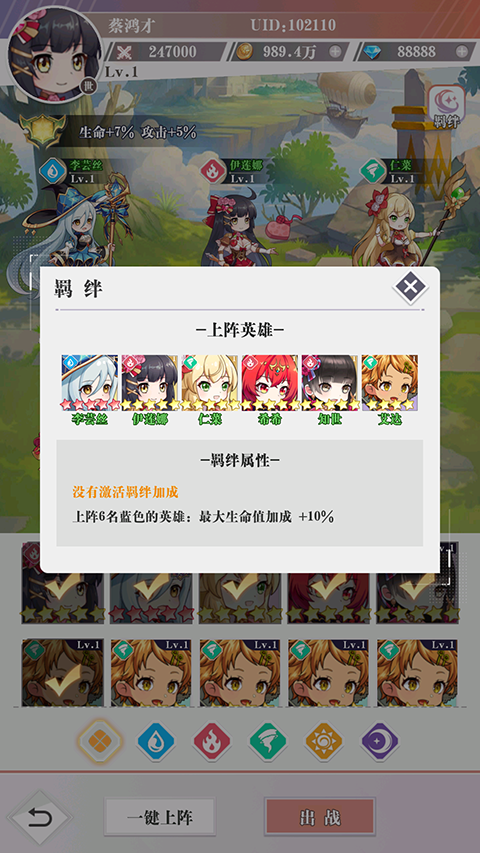 2、将抽到的角色进行上阵,且部分角色之间拥有羁绊加成。