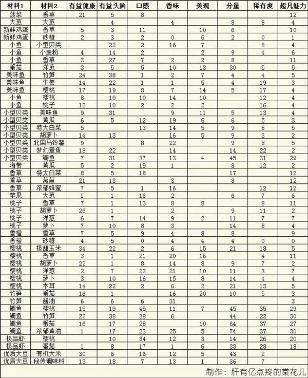 这个表也有它一定的适用范围,它在料理本身八维数值都极其临近100的时候可能会出现降低某种数值的情况。